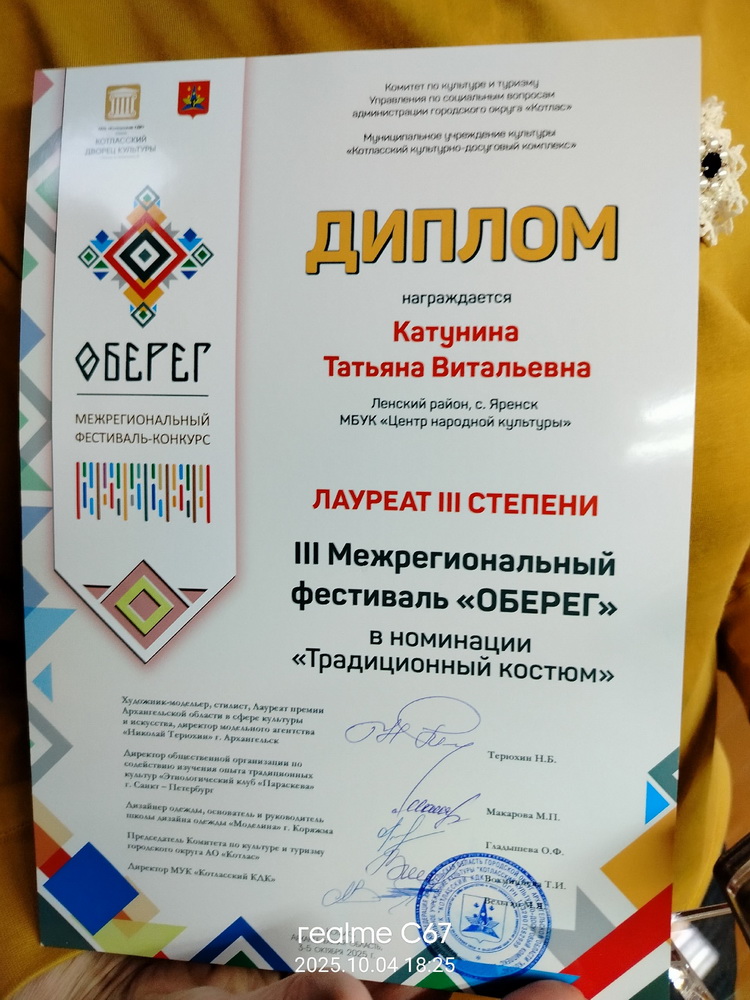 Катунина Татьяна Витальевна стала лауреатом III степени Третьего межрегионального фестиваля "Оберег" в номинации "Традиционный костюм"