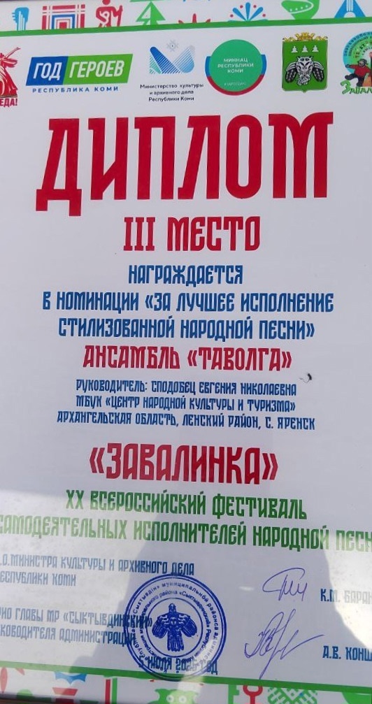 4 июля в селе Выльгорт (Республика Коми) прошёл XX Всероссийский фестиваль самодеятельных исполнителей народной песни "Завалинка", где наши артисты заняли почётное 3-е место! Было очень сложно, так как все коллективы были настоящими профессионалами.