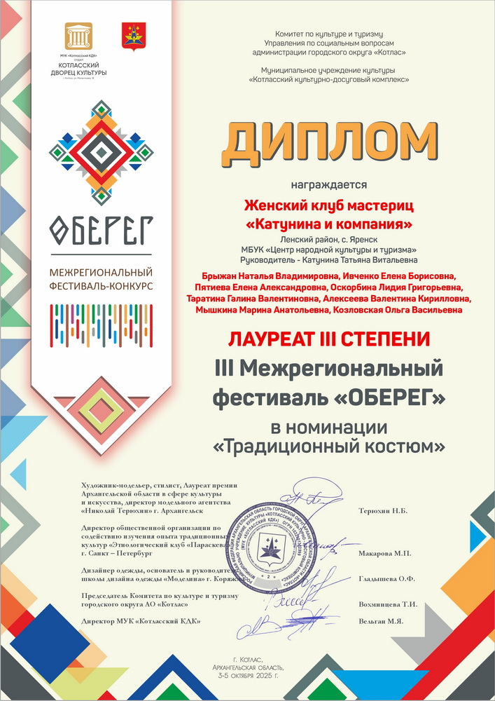 Катунина Татьяна Витальевна стала лауреатом III степени Третьего межрегионального фестиваля "Оберег" в номинации "Традиционный костюм"