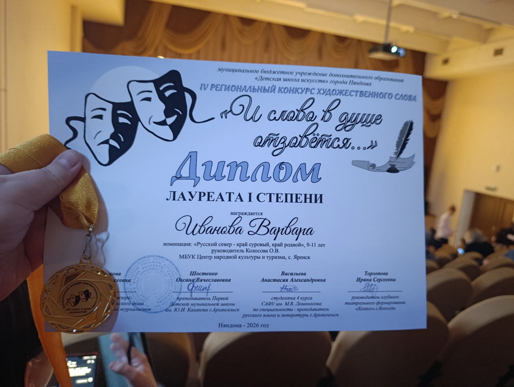 Участница театральной студии "Маска" Яренского ДК (руководитель О.В. Колосова) Варвара Иванова получила Диплом Победителя в номинации "Художественное чтение" творческого межнационального фестиваля молодёжных инициатив "Привет, сосед!", который 12-13 февраля проходил в Доме дружбы народов г. Сыктывкара.